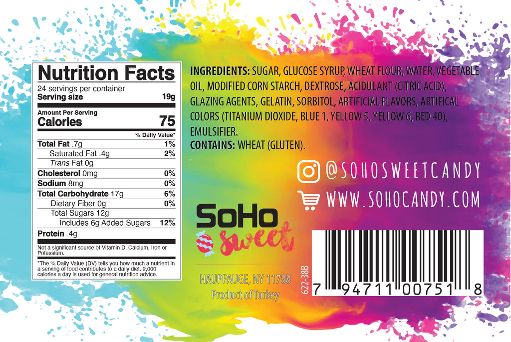 Ingredients: sugar, glucose syrup, wheat flour, water, vegetable oil, modified corn starch, dextrose, acidulant (citric acid), glazing agents, gelatin, sorbitol, artificial flavors, artifical colors (titanium dioxide, blue 1, yellow 5, yellow 6, red 40), emulsifier.